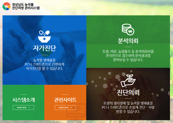 농작물 생리장애와 병해충의 적기 예방과 빠른 진단을 위해 제공하는 '농작물 진단처방 관리시스템'은 농업기술원이 구축한 사진·이미지 등 빅데이터를 기반으로 하고 있으며 농업인이 직접 진단하고 더 나아가 처방까지 받을 수 있도록 쉽고 편리하게 제작한 온라인 서비스다.