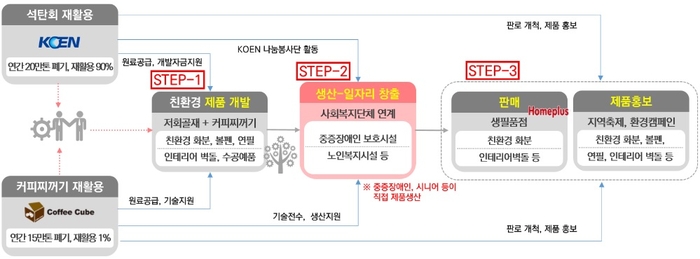 한국남동발전은 석탄재와 커피 찌꺼기를 활용해 사회취약계층(노인, 장애인 등)이 화분과 인테리어 벽돌 등을 만들 수 있는 '일자리 창출형' 협업 체계를 구축한 점에서 높은 점수를 획득해 공공기관 분야 중점 협업과제에 선정됐다.