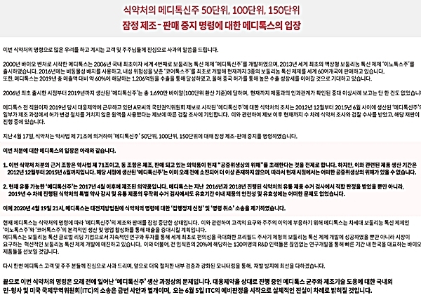 메디톡스 측은 메디톡신주의 일부가 제조 과정에서 허가 변경 절차를 거치지 않은 원액을 사용했다는 제보에 따른 검찰조사에 기인한 사건으로 보고 “현재 시점에서는 어떠한 공중위생상의 위해가 있을 수 없다”고 주장하고 있다.
