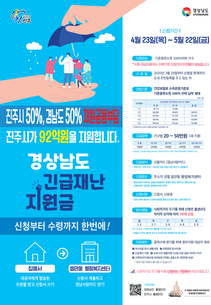 지원대상은 건강보험료 소득판정기준표 기준중위소득 100%이하 가구 총 5만 4615가구며 총사업비는 183억원이다. 재원은 진주시 50% 경남도 50% 공동부담으로 진주시가 절반인 92억원을 부담한다.