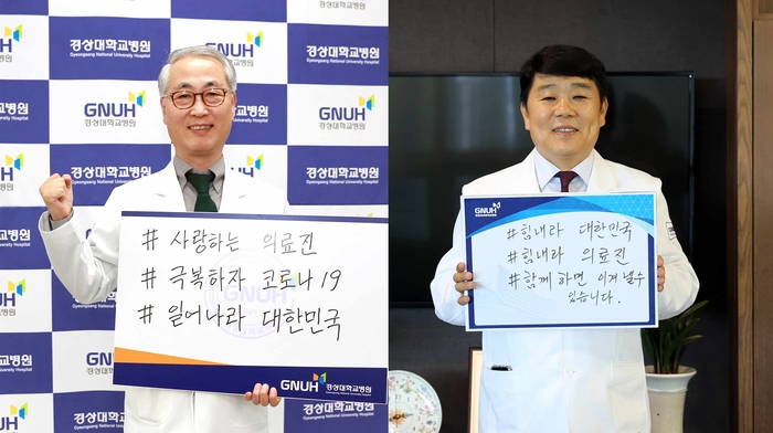 [진주=쿠키뉴스] 강연만 기자 = 윤철호 경상대병원 병원장과 이영준 창원경상대병원 병원장이 코로나19 극복을 위한 '희망캠페인 릴레이'에 동참했다.