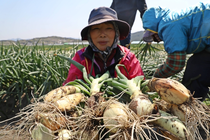 [함양=쿠키뉴스] 강연만 기자 = 경남 함양군(군수 서춘수)이 최근 지역 주작목을 대체하기 위해 집중 육성하고 있는 신소득 작목 중 하나인 함양파(스페인명 '칼솟')의 첫 수확이 진행됐다.