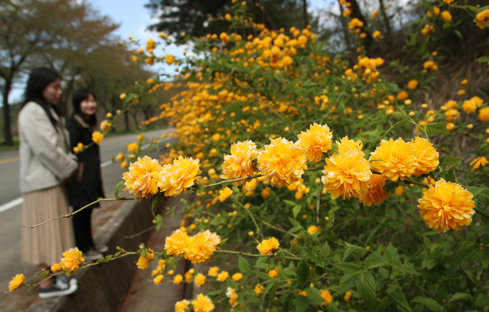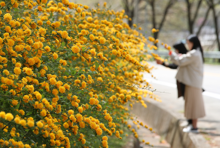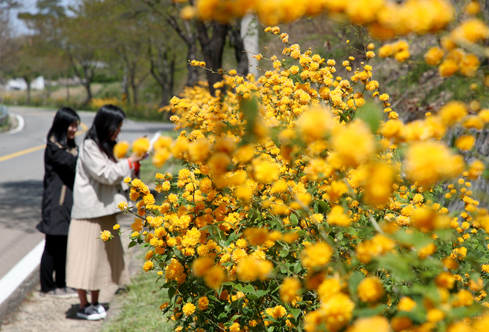 [산청=쿠키뉴스] 강연만 기자 = 따뜻한 봄기운이 만연한 29일 산청군 차황면 황매산 가는 길에 핀 노란 황매화 물결이 장관을 연출하고 있다.