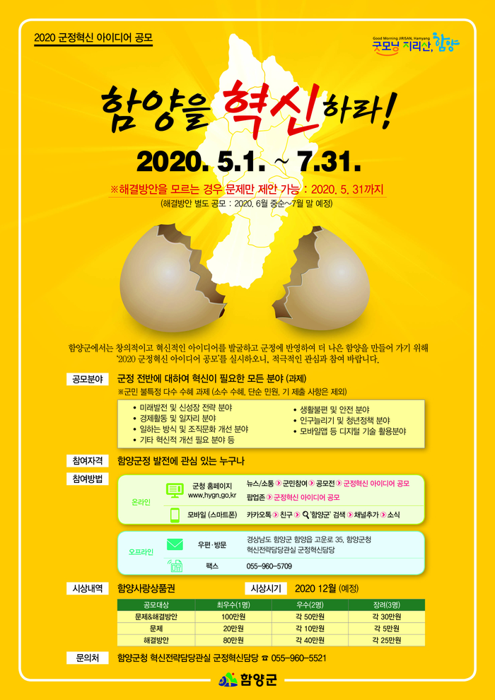 [함양=쿠키뉴스] 강연만 기자 = 경남 함양군(군수 서춘수)이 창의적이고 혁신적인 아이디어를 발굴하고 군정에 반영해 더 나은 함양을 만들어 가기 위해 '2020 군정혁신 아이디어 공모'를 모집한다.