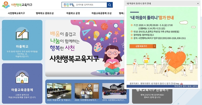 [사천=쿠키뉴스] 강연만 기자 = 경남 사천교육지원청(교육장 김법곤)이 사천지역 전 유·초·중학교 학생과 가족을 대상으로 지난 4월 30일부터 오는 5월 8일까지 9일간 사연을 접수하고 14일부터 22일까지 순차적으로 편지와 선물꾸러미를 배송하는 '내 마음이 들리니' 행사를 운영한다.