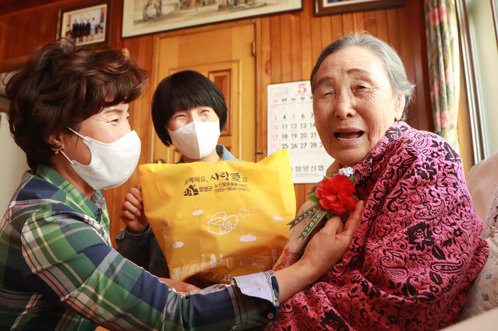 [함양=쿠키뉴스] 강연만 기자 = 경남 함양군(군수 서춘수)이 코로나19의 영향으로 군내 어버이날 경로행사 등이 취소된 가운데 취약계층 어르신들을 직접 찾아가 감사의 마음이 가득 담긴 선물을 전달했다.