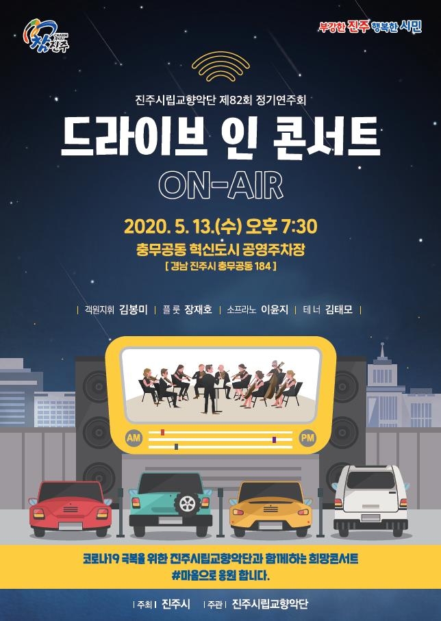 [진주=쿠키뉴스] 강연만 기자 = 경남 진주시(시장 조규일)가 공연 관람이 어려운 시민들에게 문화예술을 통해 힐링 할 수 있는 시간을 제공하고 침체된 사회적 분위기를 상승시키기 위해 오는 13일 오후 7시 30분 충무공동 소재 혁신도시 공영주차장에서 코로나19 극복을 위한 진주시립교향악단 제82회 정기연주회 <드라이브 인 콘서트> 를 개최한다.