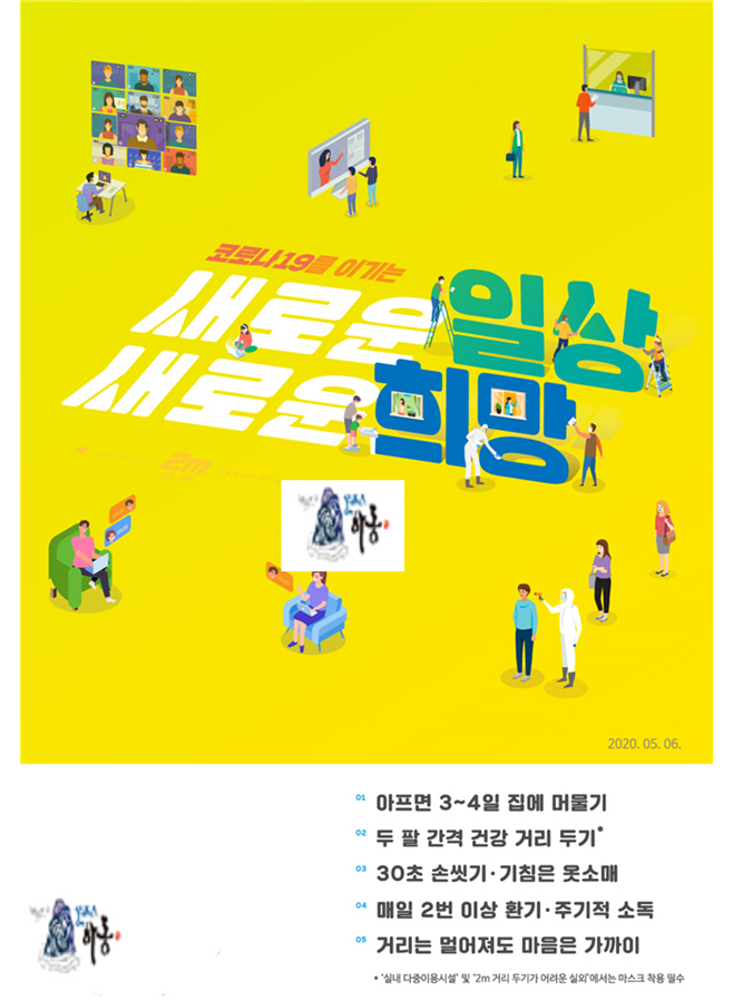 그리고 각종 시설 개방과 함께 ▲아프면 3~4일 집에서 머물기 ▲사람간 두 팔 간격 건강거리 두기 ▲30초 이상 손씻기 및 소매로 가리고 기침하기 ▲매일 2번 이상 환기 ▲거리는 멀어져도 마음은 가까이 등 군민이 지켜야 할 생활 속 거리두기 개인방역 5대 기본 수칙 실천을 홍보하고 있다.