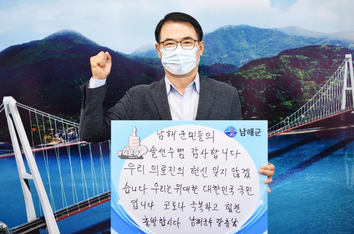 장 군수는 "의료진의 헌신을 잊지 않고 솔선수범을 보여준 남해군민들께 감사하다"는 메시지를 전하며 코로나19 극복 의지를 되새겼다. 또 "코로나19가 종결될 때까지 방심하지 않고 군민들의 안전을 위해 최선을 다하겠다"고 밝혔다.