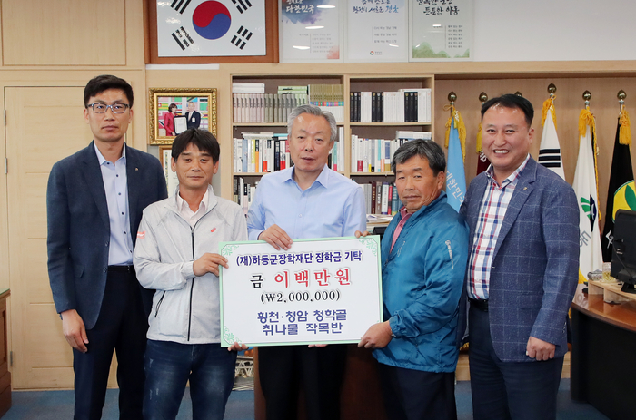 [하동=쿠키뉴스] 강연만 기자 = 경남 하동군 청학골 취나물작목반 횡천(회장 조명안)·청암(회장 정희균) 임원진이 장학기금 200만원을 하동군에 기탁했다.