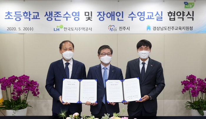 [진주=쿠키뉴스] 강연만 기자 = 경남 진주시(시장 조규일)가 한국토지주택공사(LH), 진주교육지원청과 함께 장애아동·청소년 수영교실 운영을 위한 협약식을 개최했다.