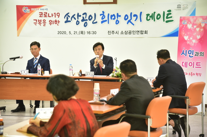 [진주=쿠키뉴스] 강연만 기자 = 조규일 진주시장이 코로나19 발생으로 인해 소상공인의 매출악화가 장기화되는 가운데 21일 오후 진주시소상공인연합회 사무실에서 '소상공인 희망 잇기 캠페인'에 참여한 업체대표들과 5월 '시민과의 데이트'시간을 가졌다.