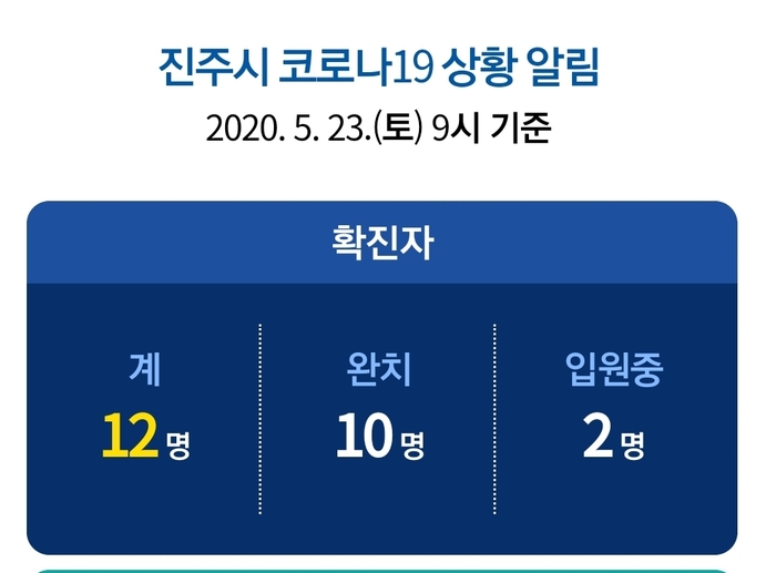진주시는 23일 9시 기준 12번 확진자의 동선을 일부 공개하고 A(60대 남성)씨의 직·간접 접촉자를 파악하기 위해 휴대폰 안내 문자를 발송했다고 밝혔다.