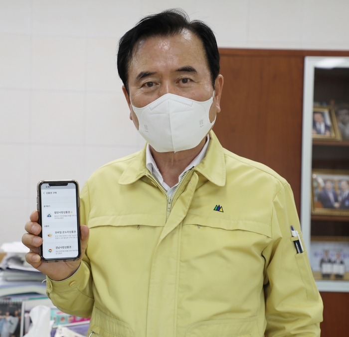 [함양=쿠키뉴스] 강연만 기자 = 경남 함양군(군수 서춘수)이 코로나19 등으로 어려움을 겪고 있는 지역 내 소상공인과 자영업자의 결제수수료 부담을 없애고 모바일 결제 방식이 증가하는 유통 환경에 대응하기 위해 (재)한국간편결제진흥원과 협약을 맺고 25일 모바일 함양사랑상품권 2억원을 발행했다.