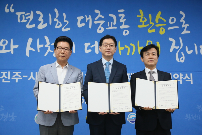 경남도와 진주·사천시가 26일 오전 사천터미널에서 진주-사천 간 광역환승할인제 도입에 따른 지자체간 행·재정적 협력사항을 담은 협약을 체결했다.