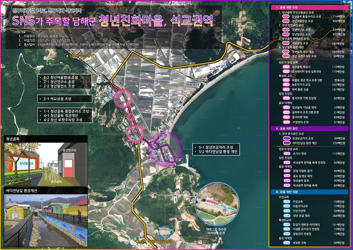 석교권역 어촌종합개발사업은 '석교 어민과 청년이 만나 새로운 어촌문화를 만들다'는 비전으로 청년 창업과 청년들의 마을정착을 지원하는 운영 프로그램을 통해 청년인구를 유입하고 일자리 창출과 주민소득증대, 마을인구 증대와 연계하는 등 청년들이 가꾸는 남해군의 대표적인 청년친화마을을 만들겠다는 계획을 앞세워 특색 있는 사업으로 주목을 받았다.