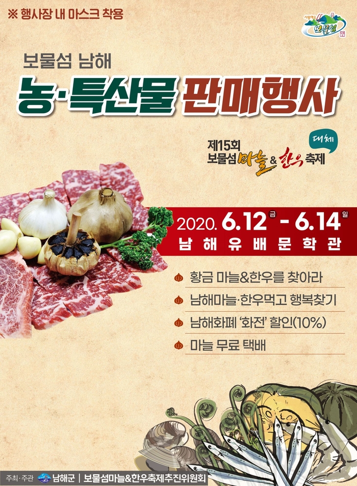 '보물섬 마늘&한우축제'를 대체할 이번 판매행사는 해풍 먹은 남해마늘, 청정 남해한우와 함께 흑마늘진액, 멸치액젓 등 가공식품과 바지락, 새우, 단호박, 참다래, 애플수박, 토마토 등 우수 농특산물 판매장도 운영될 예정이다.