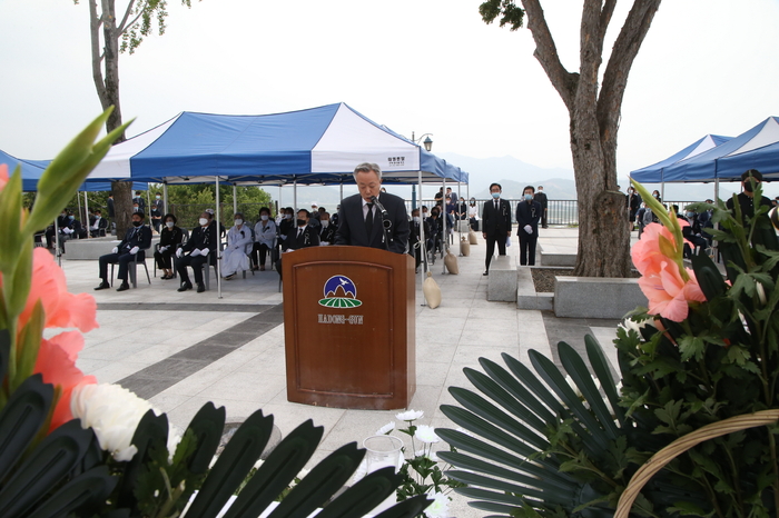 윤 군수는 이어 "식민지 전쟁 속 흔들리는 나라를 지켜낸 호국영웅뿐만 아니라 하동군 코로나19 확진자 제로를 유지할 수 있도록 각자의 위치에서 스스로 희생하며 노력 중인 군민 모두가 하동의 영웅"이라고 강조했다.