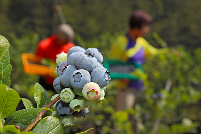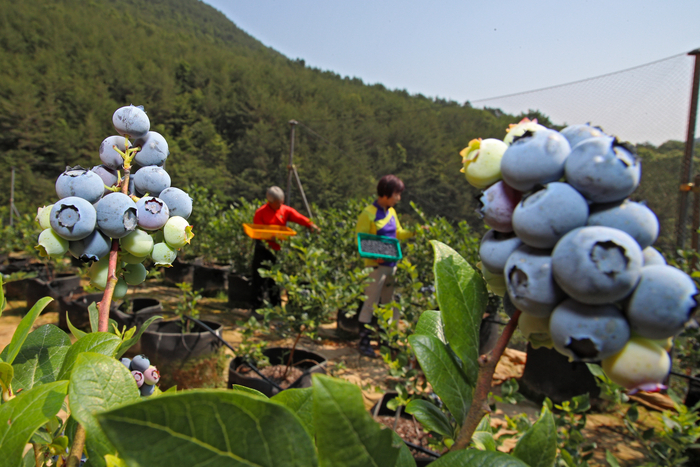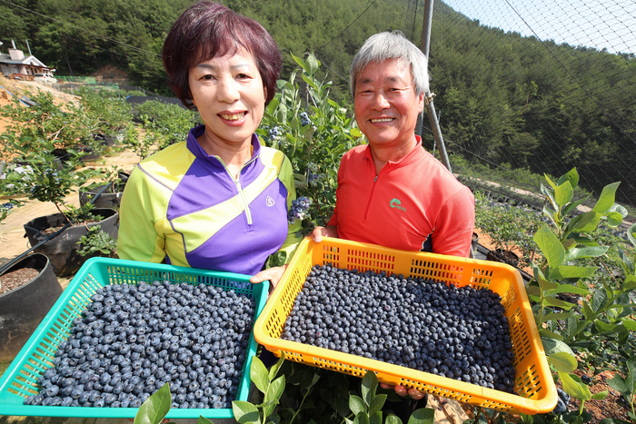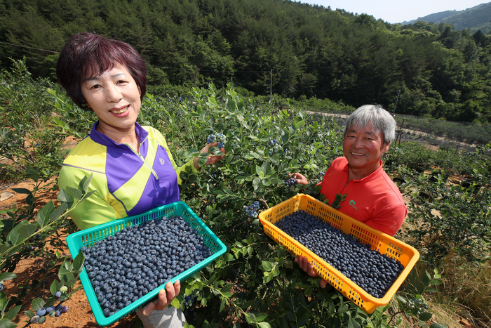 [산청=쿠키뉴스] 강연만 기자 = 산청군 단성면 백운마을 허성회(63) 정순자(58)씨 부부 농가에서 블루베리 수확이 한창이다. 황토질 야산에서 자연 그대로 재배하며 무농약 인증과 GAP 우수농산물 인증을 받아 남녀노소 안심하고 먹을 수 있다.