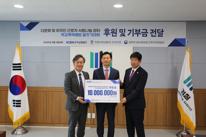 [진주=쿠키뉴스] 강연만 기자 = KOEN 한국남동발전(사장 유향열)이 9일 창원지방검찰청 진주지청에서 '다문화 및 외국인근로자 사랑나눔장터'와 '학교폭력예방 글짓기 대회' 후원을 위한 기부금을 전달했다.