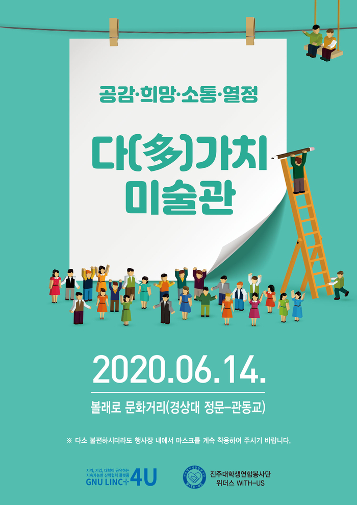 경상대 링크플러스사업단(LINC+, 단장 강상수)과 진주대학생연합봉사단 위더스(With-Us, 회장 이용진)는 오는 14일 오후 1시부터 7시까지 진주시 가좌동 볼래로 문화거리(경상대 정문-관동교)에서 '공감·희망·소통·열정-다(多)가치 미술관' 행사를 연다.
