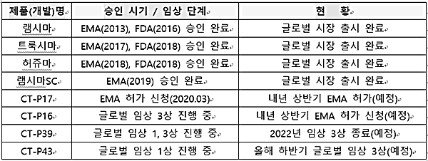 회사는 알러지성 천식 및 만성 두드러기 치료제인 ‘졸레어’(오말리주맙)의 바이오시밀러인 ‘CT-P39’가 글로벌 임상 3상에 들어간다. 회사는 최근 글로벌 임상시험수탁기관과 계약을 맺고 오는 2022년까지 CT-P39 3상 임상을 완료한다는 계획이다. 참고로 졸레어는 제넨테크와 노바티스가 개발한 항체 바이오의약품. 지난해 3조9000억 원의 매출을 올렸다.