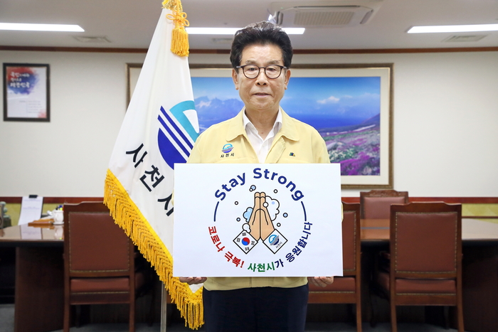 송도근 시장은 개인위생을 철저히 해 코로나19와의 싸움을 이겨내자는 의미를 담은 'Stay Strong'로고에 '코로나 극복! 사천시가 응원합니다'라는 문구를 담은 팻말을 들고 캠페인에 참여했다.