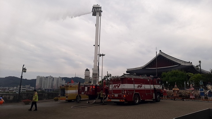 이번 훈련은 진주성내 촉석루와 의기사, 영남포정사문루, 창렬사 등 목조문화재 화재 발생 시 초동 대처 능력을 향상시키고 문화재와 인명피해를 최소화하기 위해 마련됐다.
