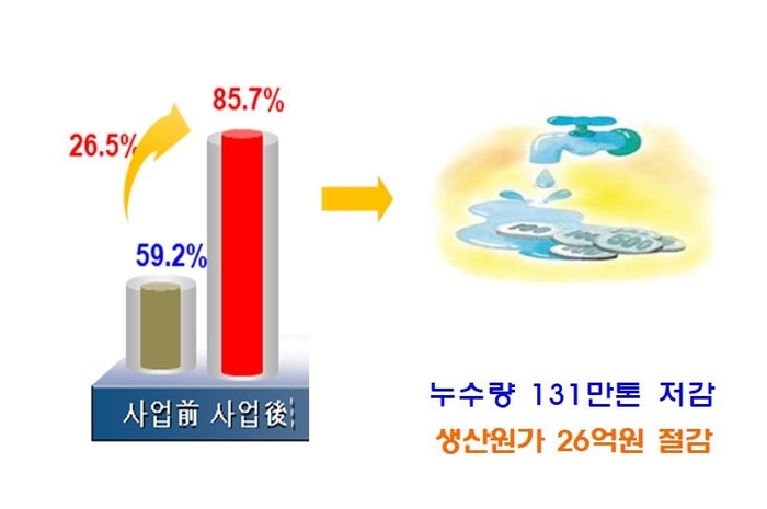 이번 사업을 통해 점차적으로 블록시스템이 구축됨에 따라 누수여부를 감시할 수 있게 됐고 누수가 의심되는 지점에는 누수탐사를 실시해 796개소의 누수지점을 복구했다. 그 결과 유수율이 사업 전 59%에서 사업목표인 85%를 이미 초과한 85.7%를 달성하는 쾌거를 이루게 됐다.