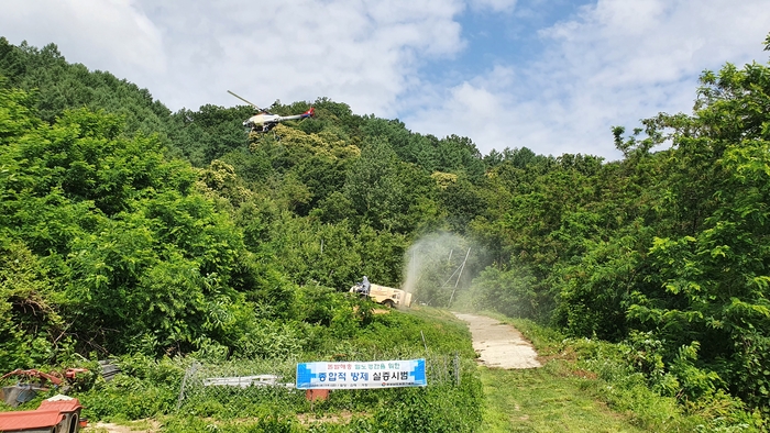 농업기술원이 실시한 종합적 방제 실증시범은 이동반경이 적은 약충기에 농경지는 SS기를 활용하고 주변 산림지역은 무인헬기로 항공방제를 정밀하게 실시해 1차 밀도를 경감시키고 추후 산란기(9~10월)에 2차 방제를 실시했다.