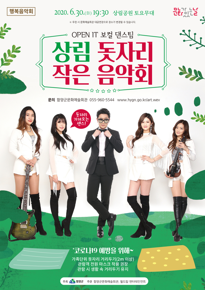 상림 돗자리 작은 음악회라는 공연 명으로 유추할 수 있듯이 공연을 관람하실 분들은 돗자리를 지참해 오는 30일 저녁 7시 30분까지 상림토요무대 앞 잔디광장을 찾으면 된다. 기타 자세한 사항은 함양군문화예술회관으로 문의하면 된다.