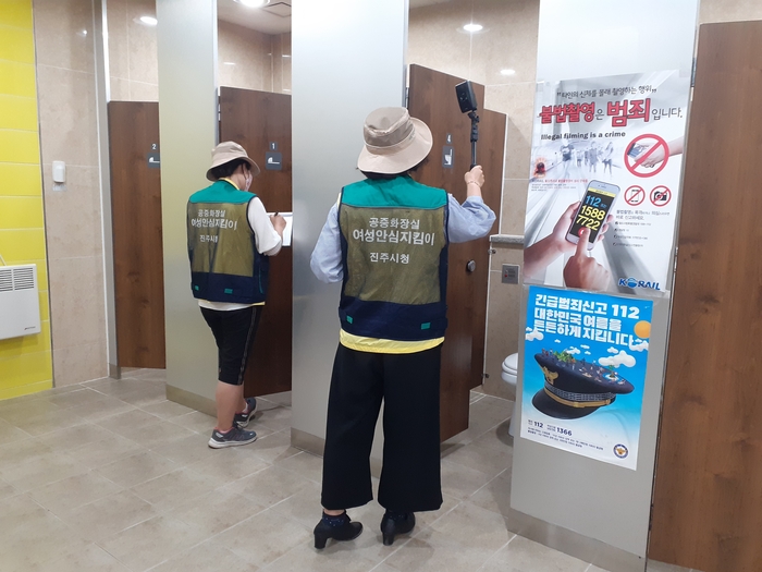 이와 함께 시는 병원, 학원, 음식점, 빌딩 등 다중이용시설의 건물주나 관리자가 화장실 불법촬영 카메라 점검을 요청할 경우 여성 안심지킴이를 통해 점검서비스를 실시한다. 점검을 희망하는 시설 관계자는 진주시청 하수시설과로 문의하면 된다.