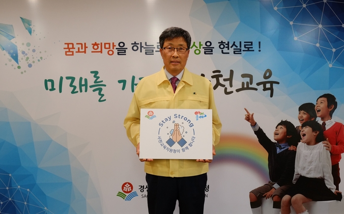 [사천=쿠키뉴스] 강연만 기자 = 김법곤 사천교육지원청 교육장이 지난 24일 코로나 19로 힘든 시기를 보내고 있는 많은 분들에게 희망을 전하기 위해 '스테이 스트롱(Stay Strong, 강하게 버티자)' 캠페인에 동참했다.