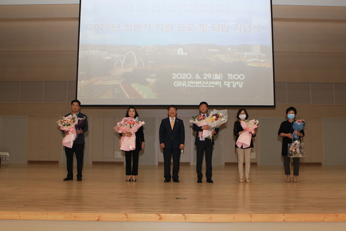 [진주=쿠키뉴스] 강연만 기자 = 경상대(GNU·총장 권순기)가 29일 오전 GNU컨벤션센터 대강당에서 '2020년 상반기 퇴임 및 공로연수 기념식'을 개최했다.