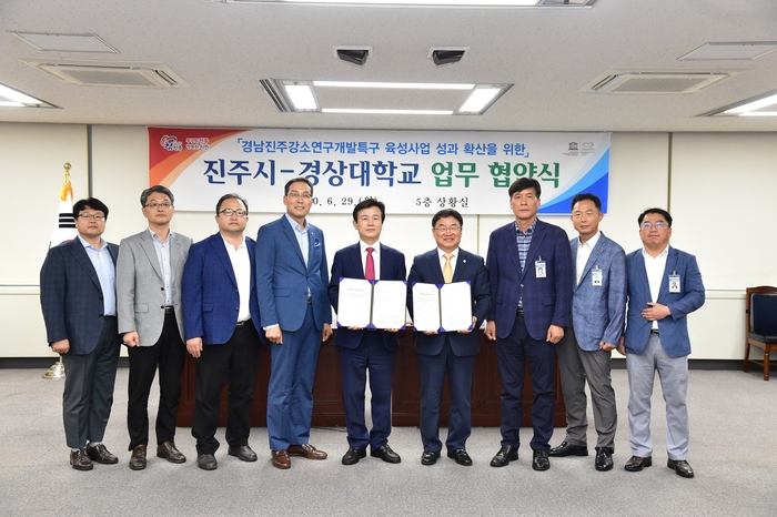 [진주=쿠키뉴스] 강연만 기자 = 진주강소연구개발특구 육성사업의 성과확산을 위한 진주시와 경상대학교의 업무협약식이 29일 오후 3시 진주시청에서 개최됐다.