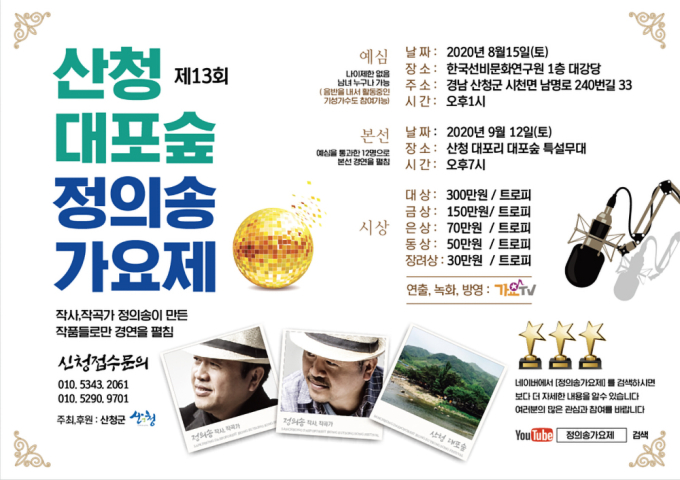군은 코로나19로 어려움을 겪는 지역경제에 활기를 불어넣는 것은 물론 산청을 찾는 방문객에게 볼거리를 제공하기 위해 가요제 개최를 결정했다.