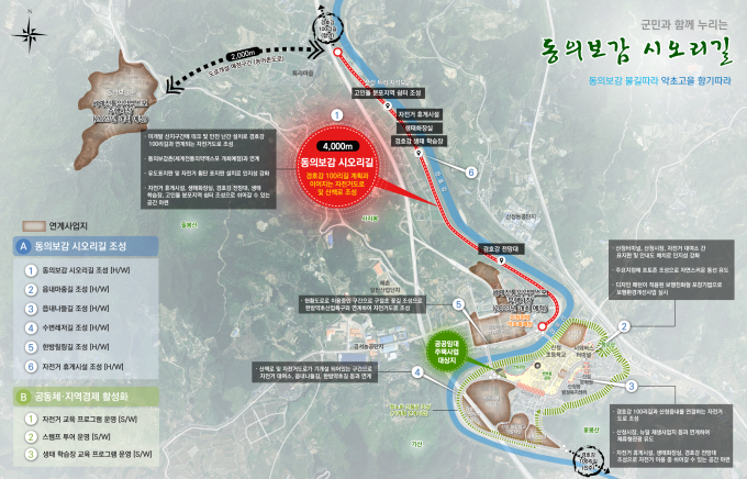특히 오는 2023년 개최를 목표로 준비 중인 '산청세계전통의약엑스포'를 대비해 행사장을 찾는 관람객들이 산청읍과 금서면에서 걷거나 자전거를 타고 동의보감촌까지 닿을 수 있도록 만든다는 계획이다.