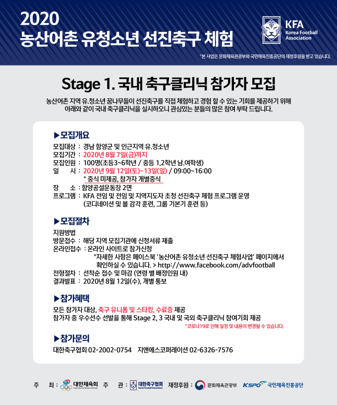 이번 농산어촌 유·청소년 선진축구 체험은 스테이지 1의 경우 8~9월까지 4개 권역에서 100명씩 모두 400명의 유·청소년을 대상으로 국내 축구 클리닉이 진행된다. 8월 22~23일에는 충북 제천시, 8월 29~30일에는 전남 영암군, 9월 5~6일에는 경기 가평군, 9월 12~13일에는 경남 함양군에서 열린다.