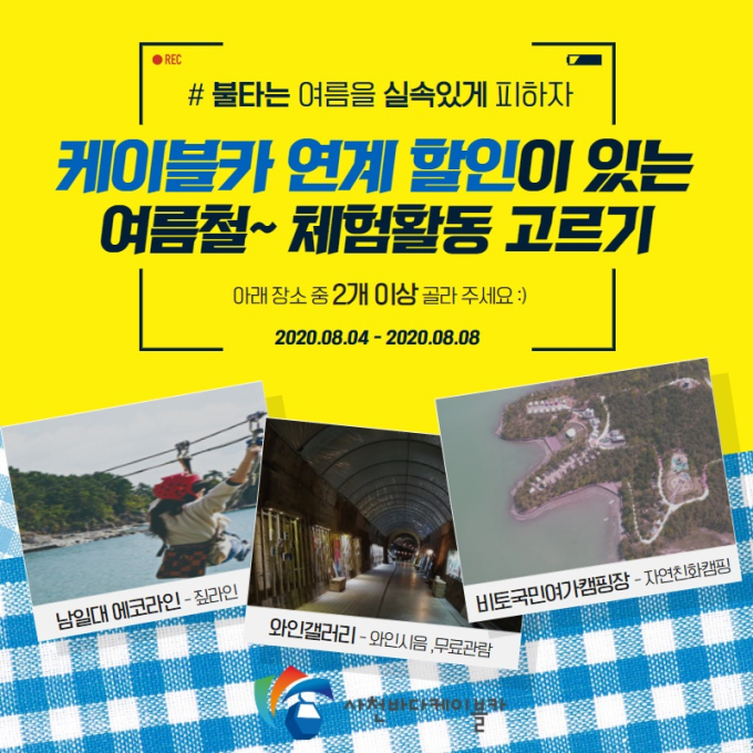 먼저 오는 4일부터 8일까지 5일간 '불타는 여름을 실속있게 피하자' 이벤트를 실시한다. 참여방법은 페이스북 또는 인스타그램 공식 계정을 팔로워한 뒤 이벤트 게시물에 케이블카와 연계 할인혜택이 있는 해양레저스포츠 또는 체험관광시설을 선택해 댓글로 남기면 된다. 댓글 내용과 기타 준수사항을 평가한 후 20명에게 2만 8000원 상당의 도미노 피자세트 기프티콘을 증정한다.