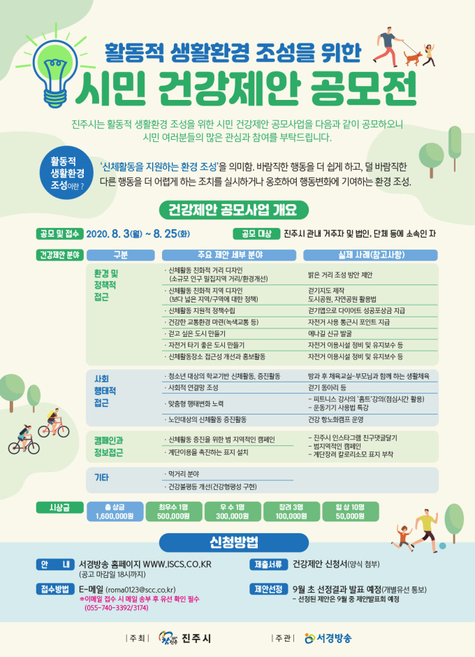 이번 공모전은 신체활동을 지원하는 환경을 조성해 시민들의 활동적 행동변화의 기회를 만들기 위해 마련됐다. 진주시 관내 거주자와 법인, 단체 등 누구나 참여 가능하며 오는 25일까지 이메일을 통해 접수하면 된다.