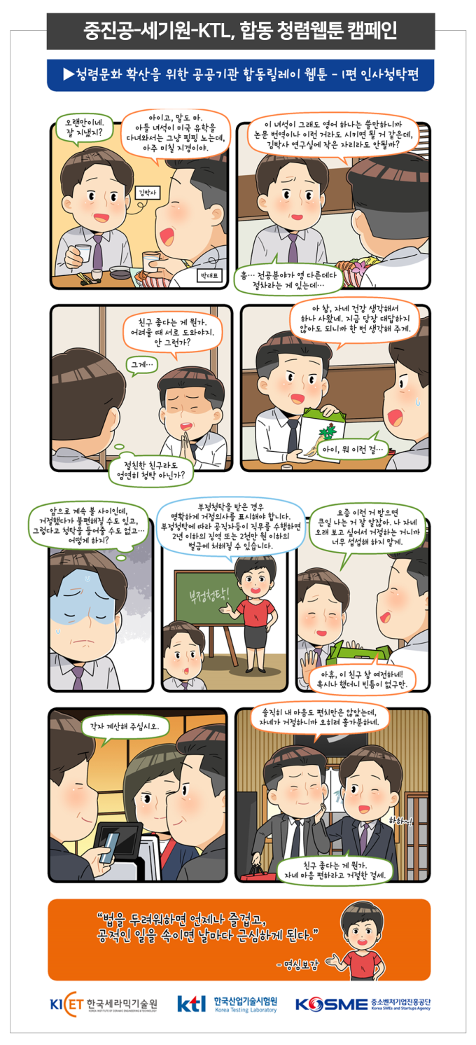 청렴웹툰 1편은 인사청탁을 주제로 세기원에서 제작했다. 올해 순차적으로 총 4편을 더 선보일 예정이다. 또한 더 많은 국민과 고객들에게 전달할 수 있도록 기관별 홈페이지와 블로그 등 SNS채널을 통해 합동으로 홍보를 진행한다.