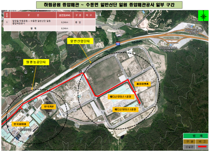 본 사업은 하림공원 기존 중압배관에서 수동터미널을 거쳐 함양일반산업단지까지 총 9.76km 구간의 도시가스 공급배관 설치사업으로 함양군은 서부경남 도시가스 사업자인 ㈜GSE와 사업추진에 대한 상호 협력과 지원방안에 대한 수차례 협의과정을 거쳐 ㈜GSE에서 사업비 33억 원 전액을 투자하기로 결정짓고 지난 4월부터 본격적인 공사에 돌입했다.