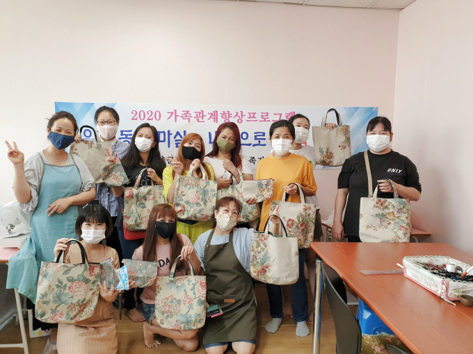 교육 내용은 반제품 원단을 활용하여 직접 실을 끼우고 한 땀 한 땀 내손으로 만든 우리가족 면마스크, 미끄럼방지 발매트, 주방앞치마 행주 등 6종을 만드는 것이었다.