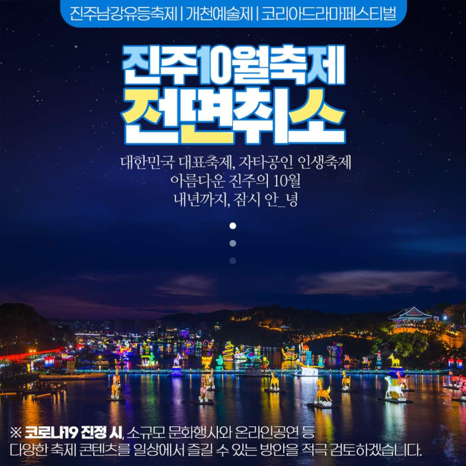 시 관계자는 "진주의 가을을 상징하는 10월 축제가 전면 취소되면서 지역사회 전반에 걸쳐 많은 어려움이 예상된다"며 "오는 2021년 진주 10월 축제가 더욱 새롭고 변화된 모습으로 재도약할 수 있도록 최선을 다하겠다"고 밝혔다.