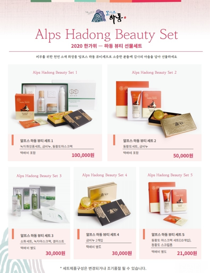 알프스하동 뷰티세트는 하동 녹차와 동황토를 이용하여 하동녹차연구소가 자체 연구·개발한 다양한 천연소재 화장품으로 구성됐다. 하동녹차를 주재료로 한 기능성 화장품, 고급화장비누인 금비누, 원적외선을 다량 흡수한 하동산 동황토 화장품 등을 한데 담았다.