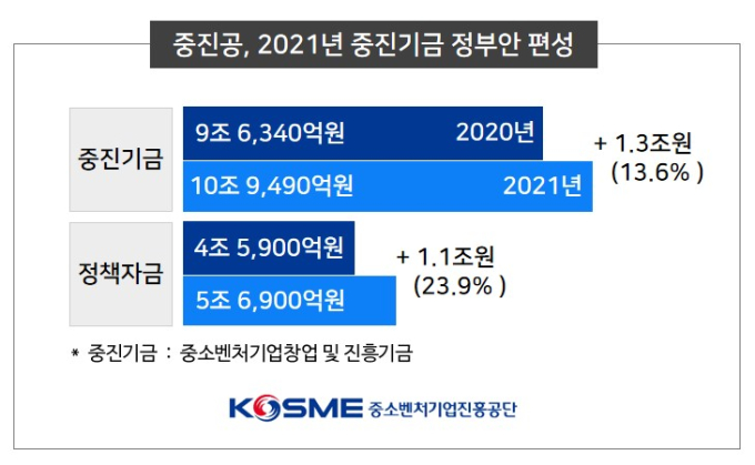 특히 포스트 코로나 시대의 중소벤처기업의 경영안정과 혁신성장을 위한 정책자금 지원 규모는 5조 6900억원으로 올해 4조 5900억원 보다 1조 1000억원 확대됐다.