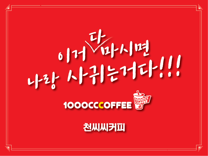 그래! 좋은 재료로 아끼지 말고 많은 양을 맛있게 드리고 최소한의 이익만 남는다면 언젠가는 고객님들이 1000cc커피의 마음을 알아 주실거야 라고요. 특별히 이렇게 하겠다 저렇게 하겠다는 생각보단 진심을 알아주시면 사랑받을 수 있을 거란 생각에 전국에서 가장 싸게 전국에서 가장 크게 전국에서 가장 맛있게 소비자에게 다가가자는 마음으로 진심을 담아 홍보하고 있습니다.