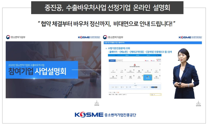 기존 오프라인 사업 설명회를 통해 추진절차, 협약체결, 주요 서비스와 바우처 정산 방법을 안내해 왔지만, 올해 코로나19 확산 예방을 위해 온라인 설명회로 전환해 진행한다. 수출바우처사업 설명회 영상은 9월 한 달간 언제든지 접속 링크를 통해 시청할 수 있다.