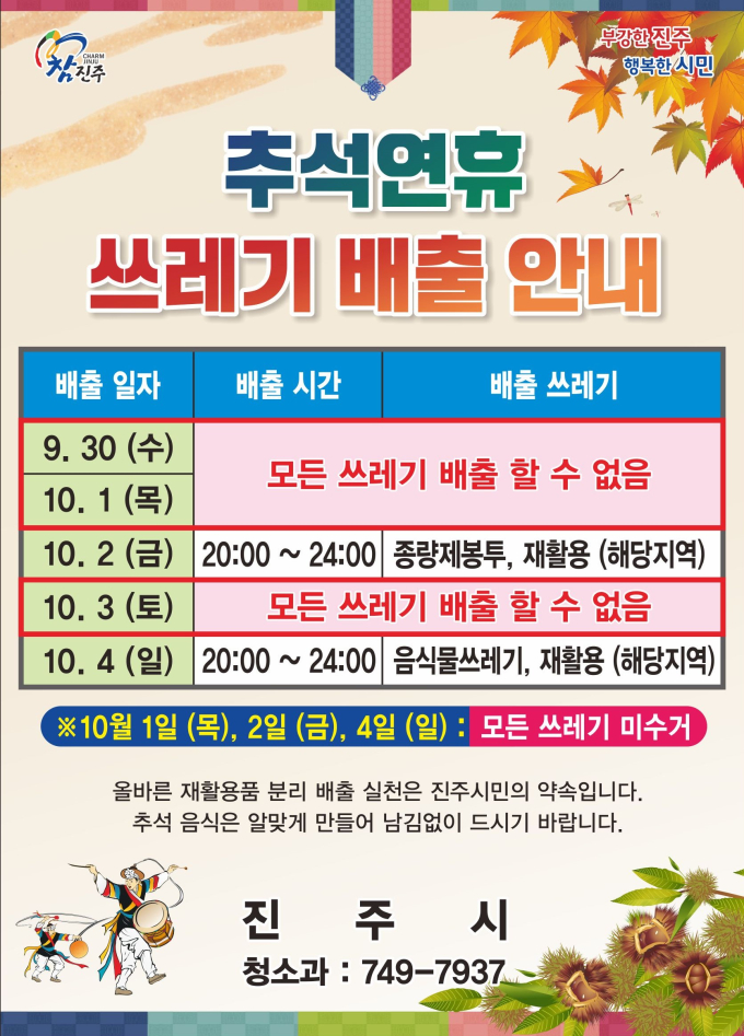 시 관계자는 "코로나19로 지친 시민들이 쾌적한 추석을 보내도록 추석 연휴 청소대책 추진에 최선을 다하겠다"며 "연휴 기간 중 오는 10월 1일, 2일, 4일은 모든 쓰레기를 수거하지 않기 때문에 쓰레기로 인한 민원이 발생하지 않도록 배출일을 준수하는 등 성숙한 시민의식을 발휘해 주시길 당부드린다"고 말했다.