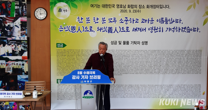 윤상기 군수가 23일 오전 11시 영호남 화합의 상징 화개장터에서 열린 8월 수해 극복에 따른 감사 브리핑을 통해 하동지역 수재민의 아픔을 위로하며 수해 기부금과 구호물품을 기탁하고 응급복구 작업에 참여한 모든 자원봉사자들에게 감사의 뜻을 전했다.